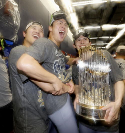 ワールドシリーズ2連覇を達成し、シャンパンファイトで盛り上がる(左から)大谷翔平、山本由伸、トロフィーを持つ佐々木朗希(提供・共同通信社)