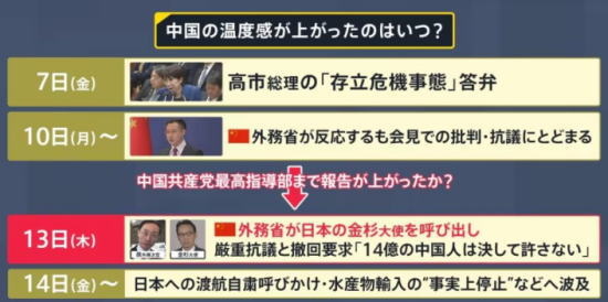 >中国側が急に対応を強めたタイミングにも注目したい。高市総理の答弁があった7日から13日までは外務省報道官による批判・抗議にとどまっていたが、13日夜に中国外務省の孫衛東外務次官が日本の金杉憲治大使を呼び出して厳重抗議。14日以降、渡航自粛要請や水産物輸入停止など対応が強化された。