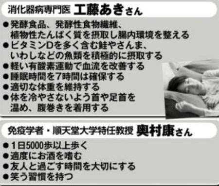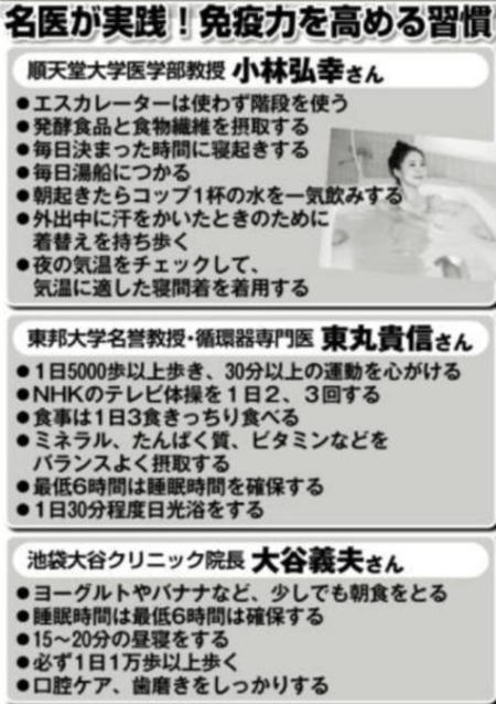 <参考=「名医10人が実践する《免疫力を上げる習慣》「睡眠時間は6時間確保」「起床後はコップ1杯の水を飲む」「日中はしょうが紅茶」「お風呂では目を温める」ほか」(女性セブン)>