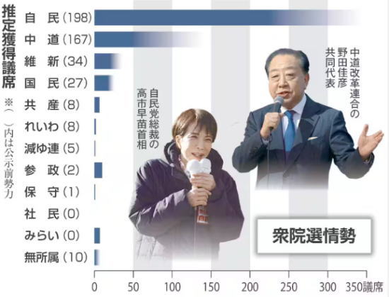 <参考=「想定以上の「高市旋風」で“有名裏金議員”も当選圏内に 前回落選の下村氏は「優勢」「3万の公明票喪失」で絶望視されていた萩生田氏や丸川氏も「接戦」に」(デイリー新潮)>
