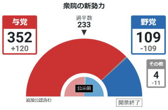 >自民党の獲得議席が310となり、民主党(当時)が2009年に政権交代を果たしたときに獲得し、 単独政党として過去最多だった308を超えた 。