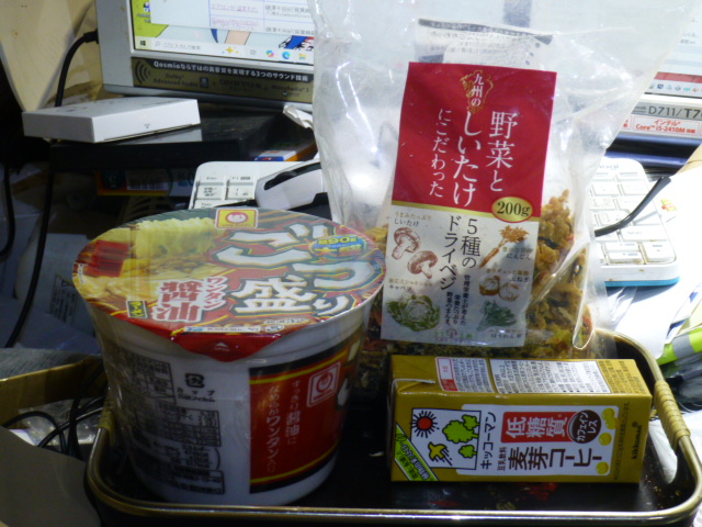 カップごつ盛りワンタン醤油ラーメン、乾燥野菜(味噌汁の具)、豆乳飲料(麦芽コーヒー)。