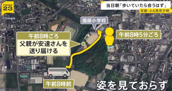 <参考=「【京都小6男児行方不明】“当日朝の小学校”で新証言「歩いて行っているなら、会うはず」同じ時間帯に到着した児童たち「安達さんを見ていない」【news23】」(TBS)>