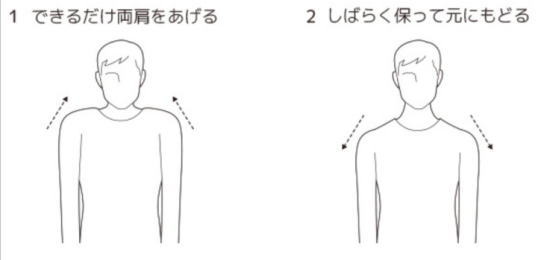 >背筋を伸ばして、両肩をすくめるようにして持ち上げます。10秒ほどキープしたら、肩を落として一気に脱力します。