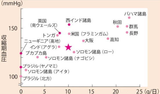 >血圧と塩分摂取量の関係について、1980年に興味深い調査が実施されました。その結果をまとめたのが図「血圧は塩分摂取量だけでは決まらない」です。これは世界各地に住む 50 代男性の収縮期血圧の平均と、それぞれの塩分摂取量の関係を見たもので、ここに現代の日本人の数値を星印で書き加えてあります。
