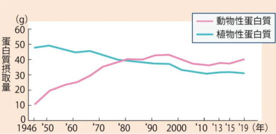 >図「動物性蛋白質は大事だが、とりすぎに要注意」のグラフからわかるように、日本人は長年にわたって豆や豆腐などの大豆製品、そして米、野菜に含まれる植物性蛋白質を中心に摂取してきました。それが次第に動物性蛋白質の摂取が増え、近年では動物性蛋白質が少々過剰になっています。
