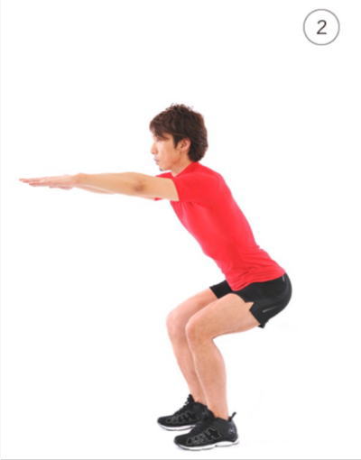 ・膝を曲げる時に、膝の位置がつま先よりも後ろになるようなフォームを心がける。